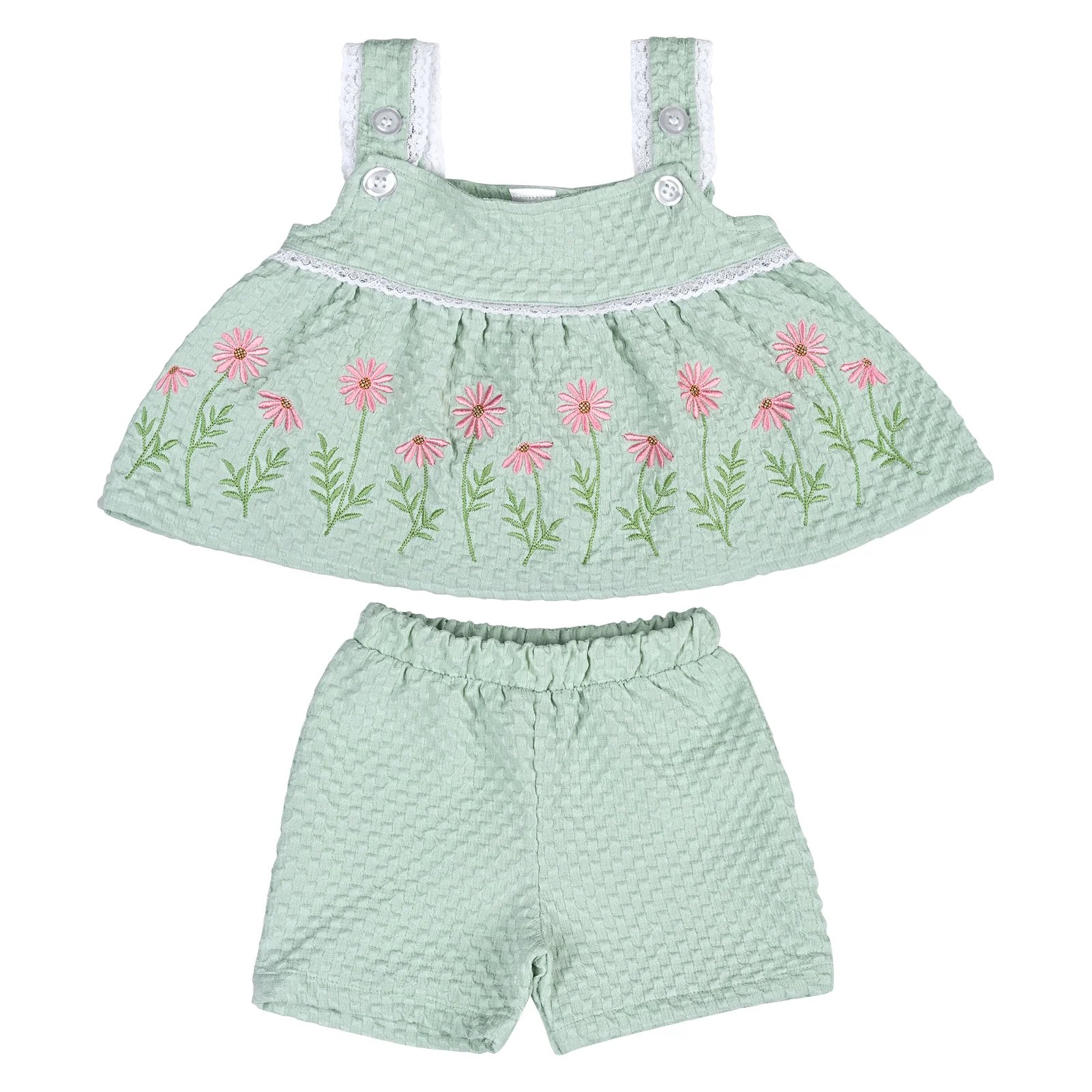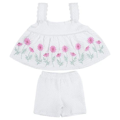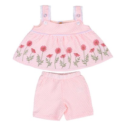 The Berry Baby Girl Set is a charming outfit designed with delicate floral embroidery and a flared sleeveless top paired with comfy shorts. Crafted from soft cotton interlock fabric, this set is perfect for keeping your little one stylish and comfortable all day. Available in beautiful colors, it makes an ideal choice for casual wear, outings, or playtime. Suitable for babies 3–18 months.